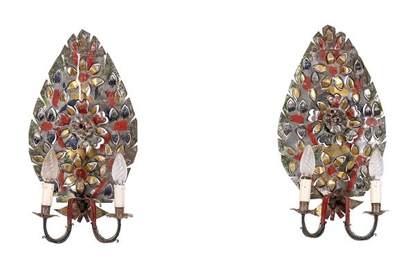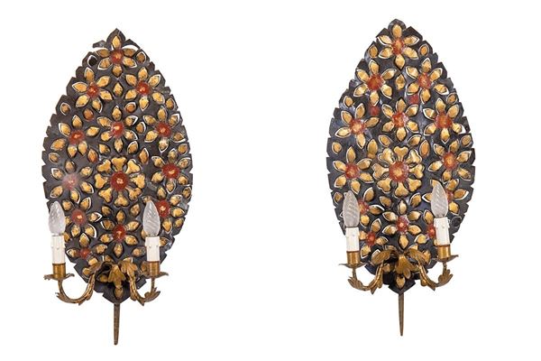 Quattro appliques di forma ovale in lamierino sbalzato decorato a fiori laccati e dorati, due braccia portaluce.