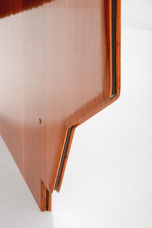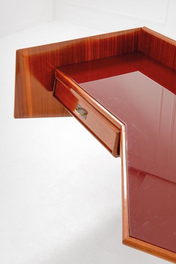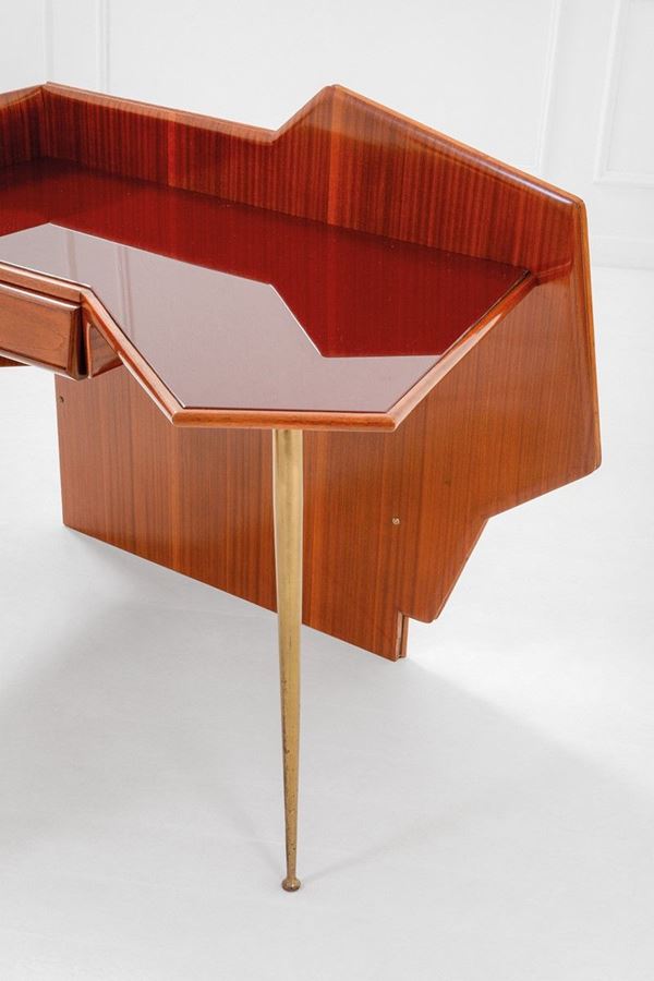 Legno, ottone, cristallo colorato molato.