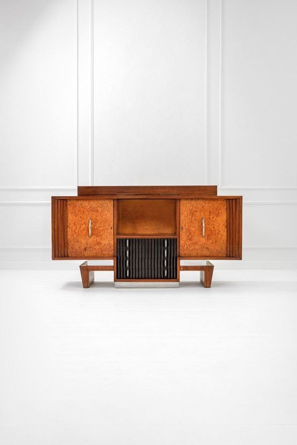 Legno rivestito in radica e tinto, alluminio, cristallo molato.