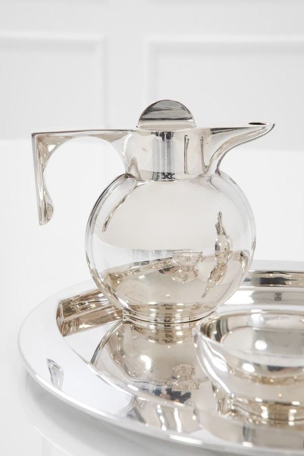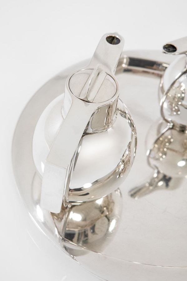 Vassoio h cm 1,5, diam. cm 28,5; teiera cm 11,5x14,5x9; lattiera cm 10x12,5x7; ciotola cm 4x8,5x7