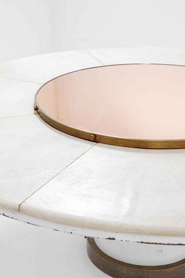 Struttura in metallo smaltato e ottone, piano rivestito in pelle con rialzo girevole specchiato.