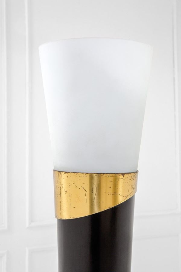 Legno, ottone, vetro opalino satinato.