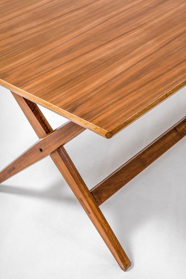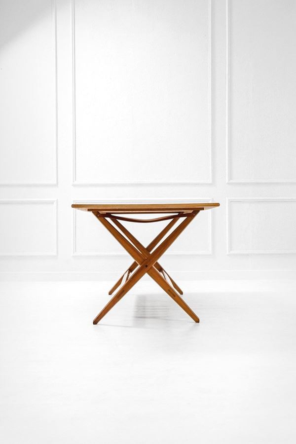 Struttura e piano in legno sospeso su nastri in cuoio.