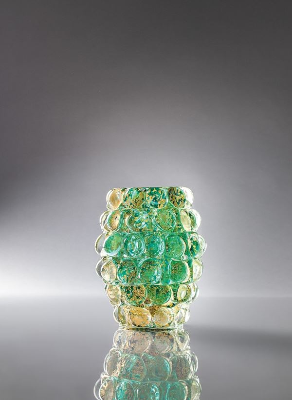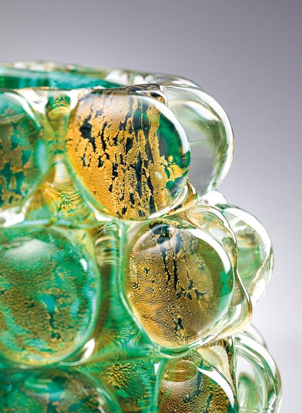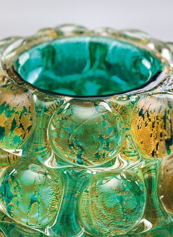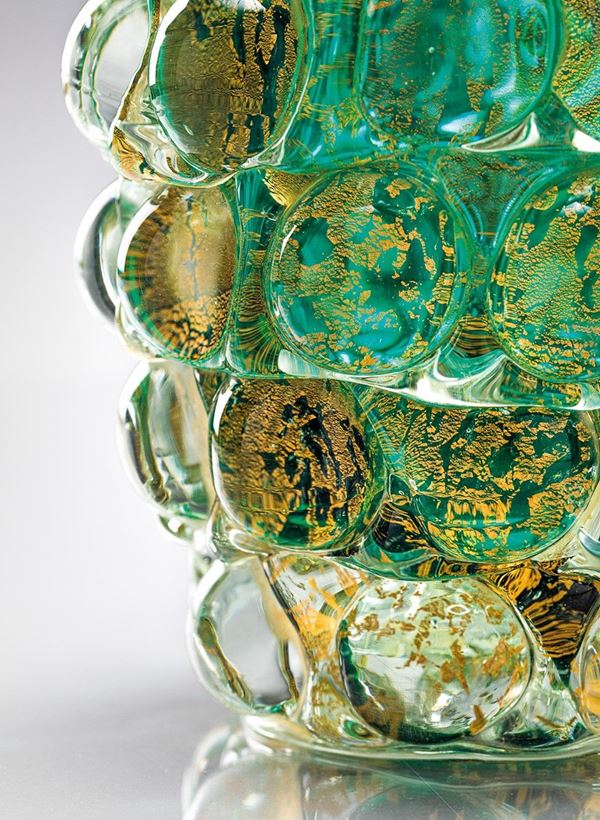 Vetro verde di forte spessore ottenuto con la tecnica della colorazione a caldo senza fusione, decorato con foglia d’oro e con grosse semisfere in vetro trasparente.