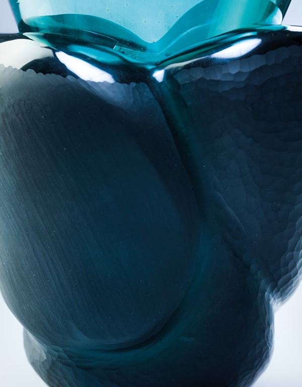 Parte superiore in vetro soffiato, base in vetro massello e superficie battuta.