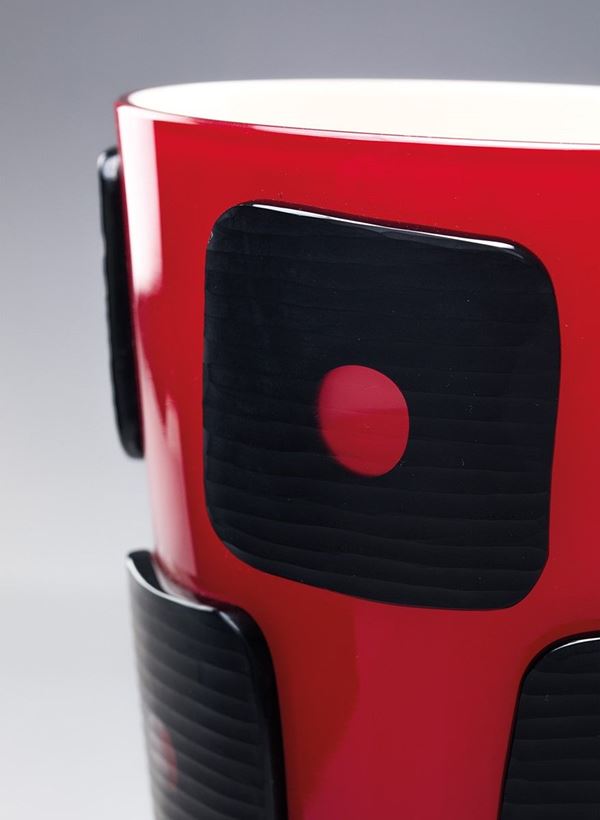 Vetro incamiciato rosso con tessere in vetro martellato nero opaco applicate a caldo.