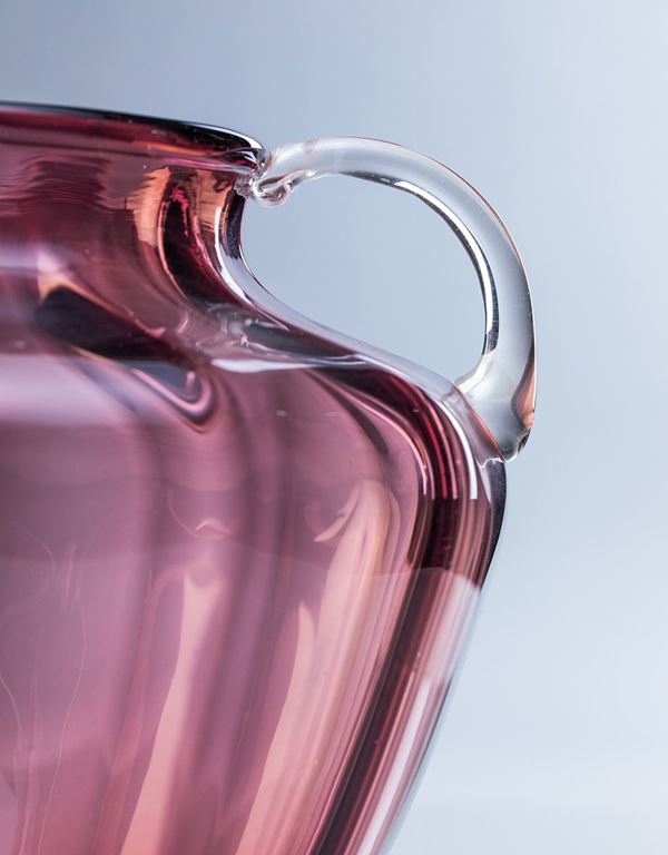 Vetro trasparente ametista con anse laterali in vetro cristallo.
