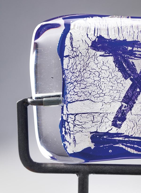Vetro cristallo con inclusione di vetro violetto, supporto in metallo.