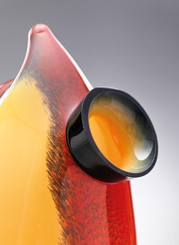 Vetro policromo con due bocche laterali asimmetriche e rifiniture in vetro nero.