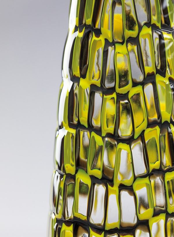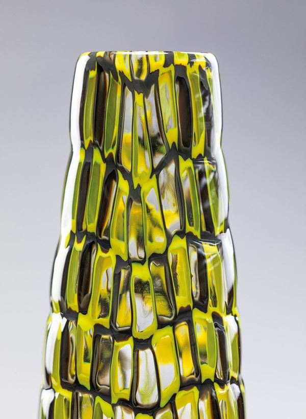 Vetro a murrine in pasta vitrea giallo-nero e occhio centrale cristallo.
