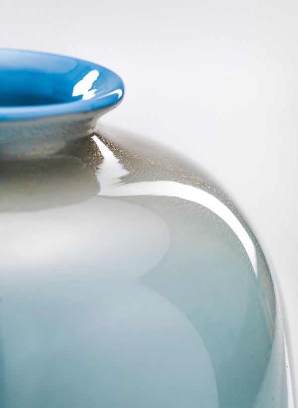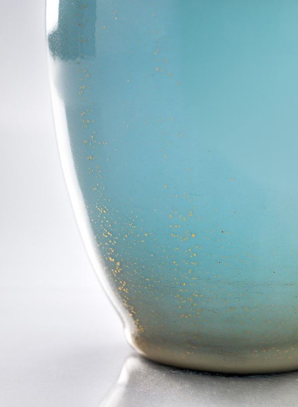 Vetro azzurrino alga incamiciato a più strati con applicazione di foglia d’oro.