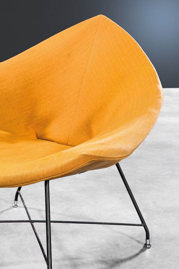 Metallo smaltato, ottone, masonite curvata, gommapiuma, tessuto.