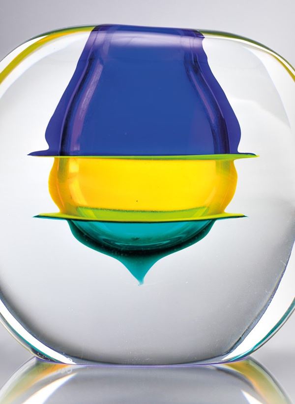 Vetro cristallo con elementi sommersi a fasce in vetro policromo.