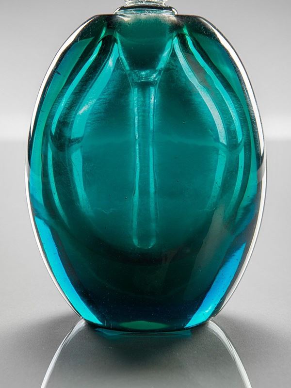 Vetro verde con superficie fortemente iridata e tappo in vetro cristallo a forma di piuma.