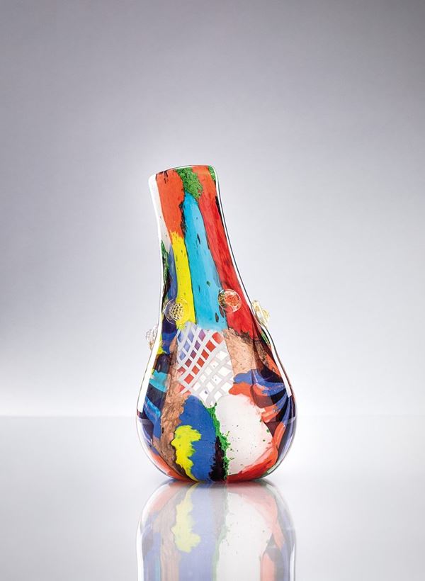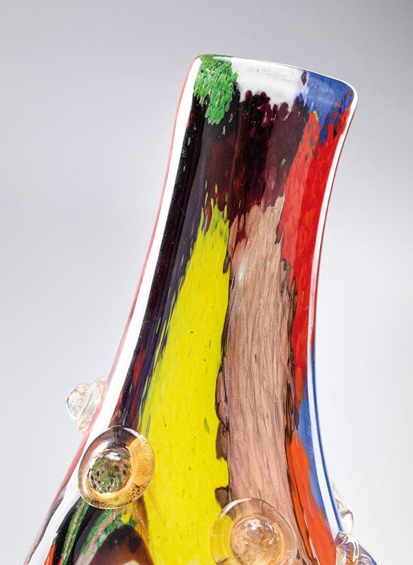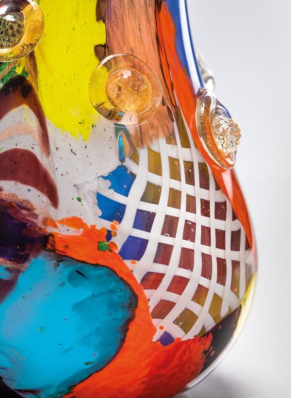 Macchie irregolari di vetro policromo, avventurina e inserti di canne a reticello. Grande murrina a stella e applicazioni a caldo.