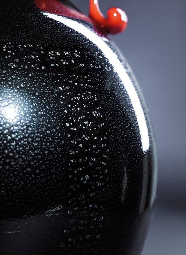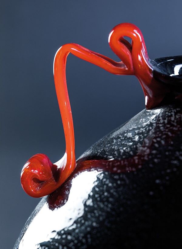 Vetro nero e foglia d'argento con anse in pasta vitrea rossa applicate a caldo.
