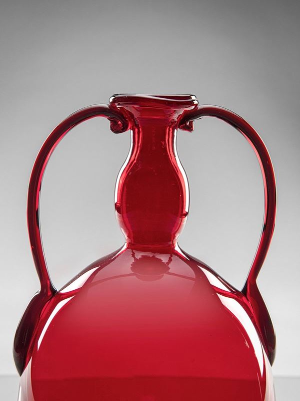Vetro rosso rubino con prese laterali applicate a caldo e piede circolare.