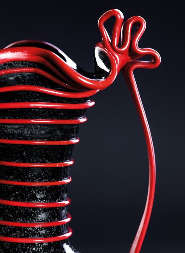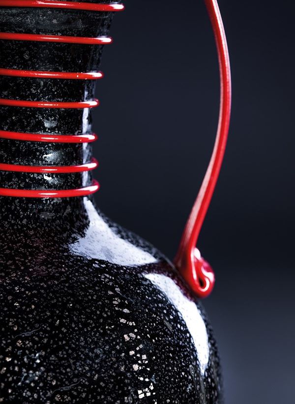 Vetro nero e foglia d’argento con anse in pasta vitrea rossa applicate a caldo.