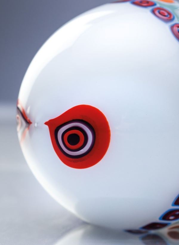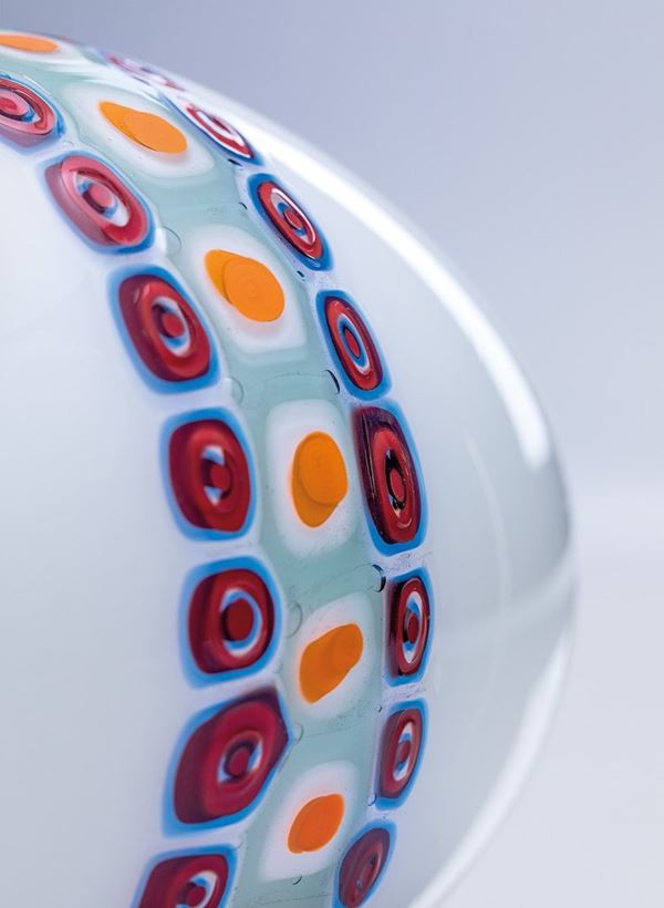 Vetro lattimo decorato da due grandi murrine policrome a guisa di occhi e fascia di murrine policrome su tutta la circonferenza.
