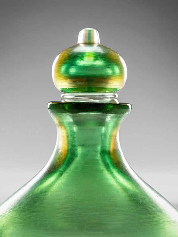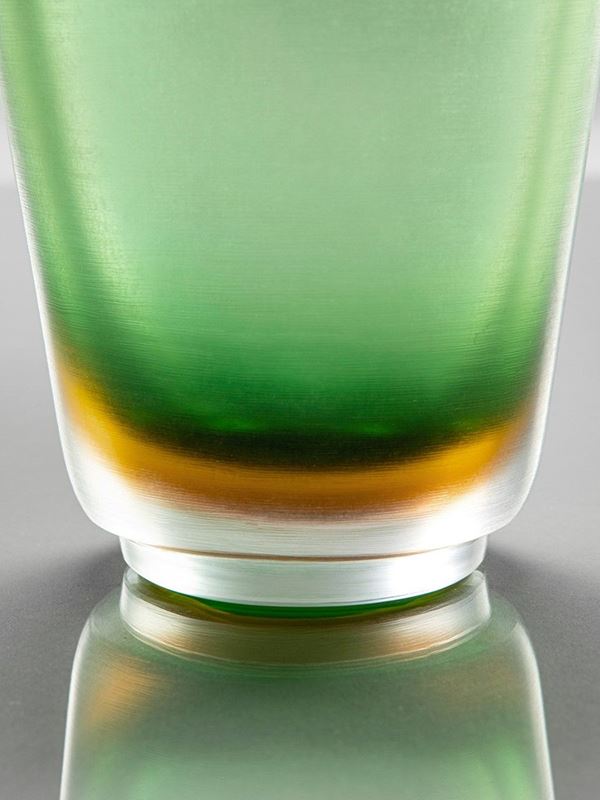 Vetro pesante verde, sommerso e rifinito da leggere incisioni orizzontali su tutta la superficie.