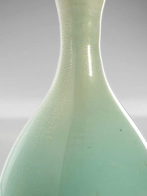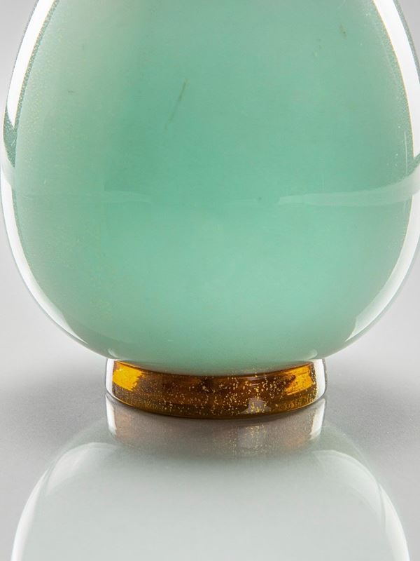 Vetro incamiciato di cui l’esterno a foglia d’oro e base cilindrica in cristallo a foglia d’oro.