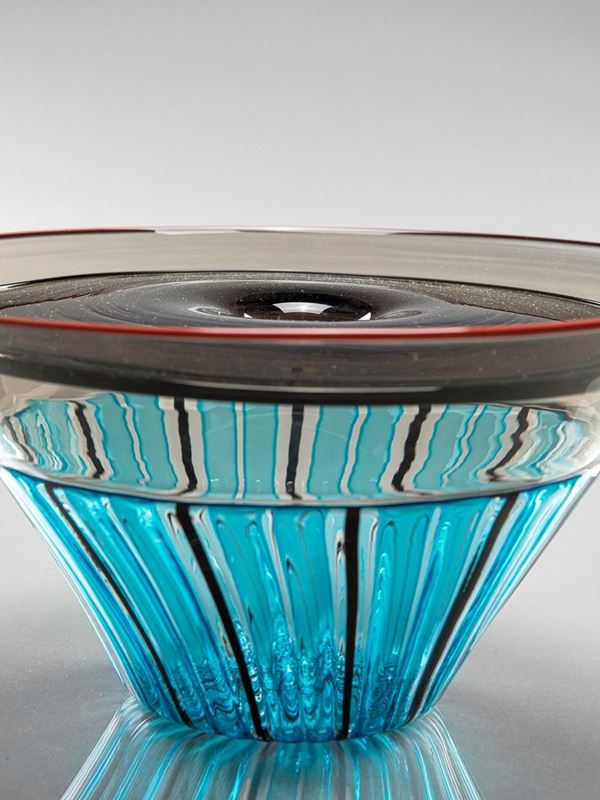 Vetro soffiato lavorato a canne e successivamente ad incalmo. All’interno del vaso è posizionato un disco con foro centrale.