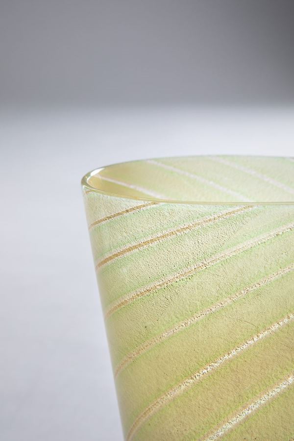 Vetro soffiato lavorato a canne piatte a spirale e foglia d’oro.