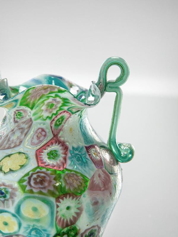 Vetro soffiato a murrine policrome con due anse applicate a caldo.