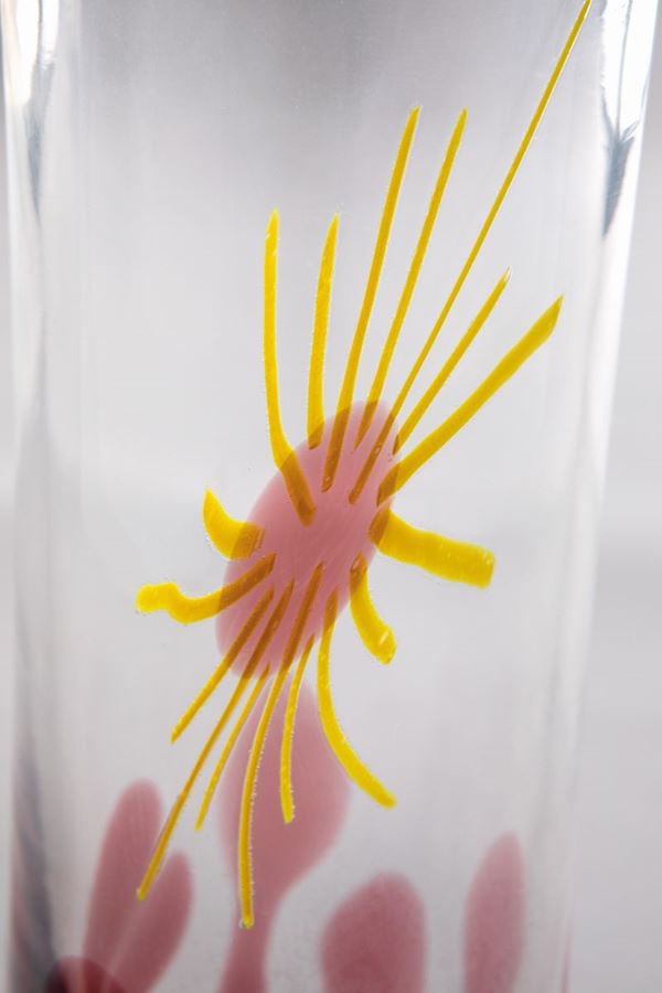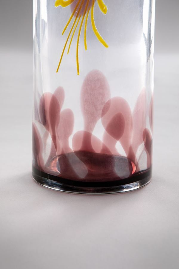 Vetro soffiato cristallo con macchie ametista e fili gialli a mo' di raggi.
