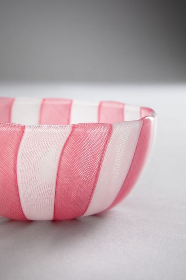 Vetro soffiato zanfirico a canne verticali a rete lattimo e rosa.