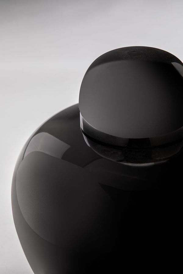 Vetro soffiato nero con forme ispirate all’arte orientale.