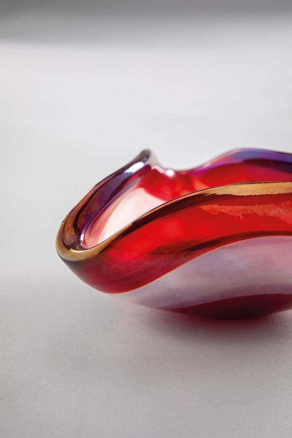 Vetro soffiato con bordo rosso amaranto e superficie iridata.