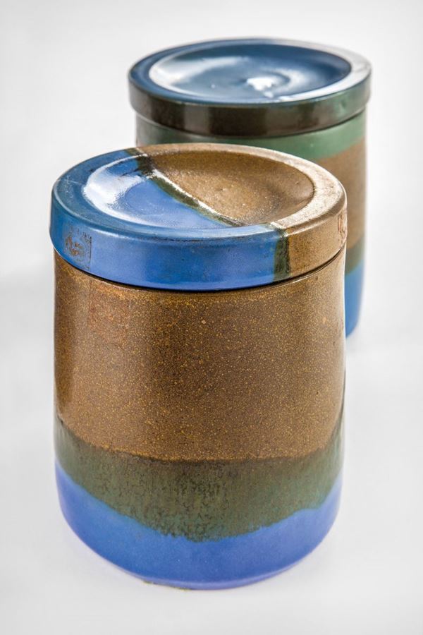 Servizio composto da: caraffa, 6 bicchieri, 2 barattoli con tappo, 2 piatti.