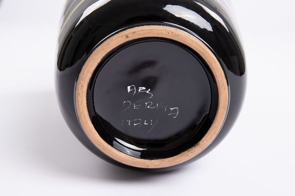 VasoCeramica invetriata nera con superficie decorata da segmenti orizzontali multicolori.Prod ARS Deruta, 1950 ca.Marcato sotto la base Ars Deruta Italy.