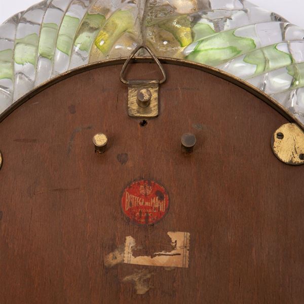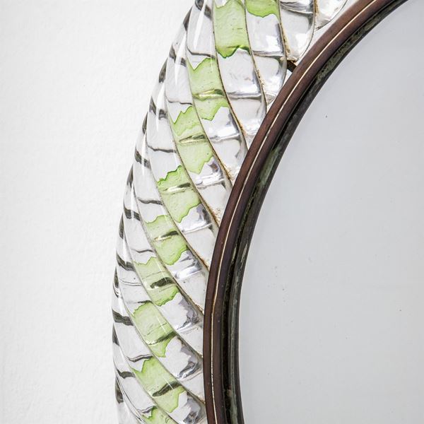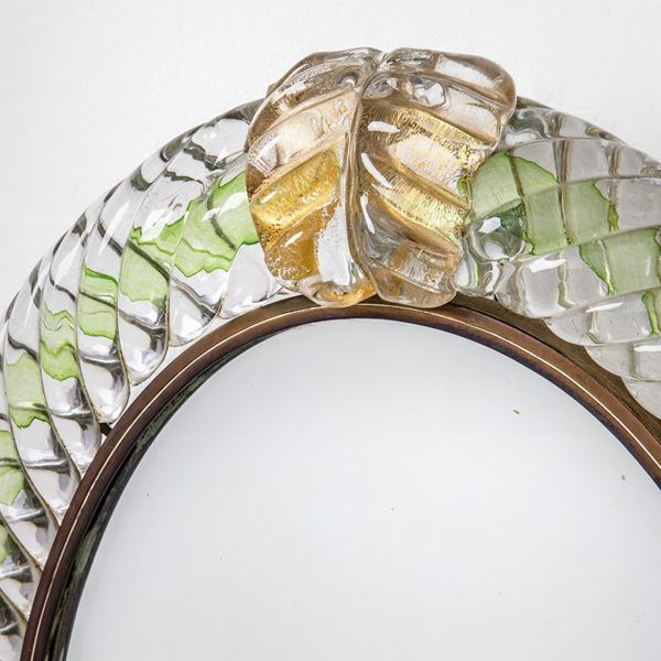 Piccolo specchio da pareteVetro cordonato trasparente con decoro in verde e applicazione di foglia d'oro, vetro specchiato.Prod. Barovier & Toso, anni '40Etichetta Bottega del Mago