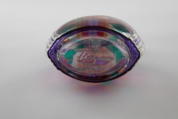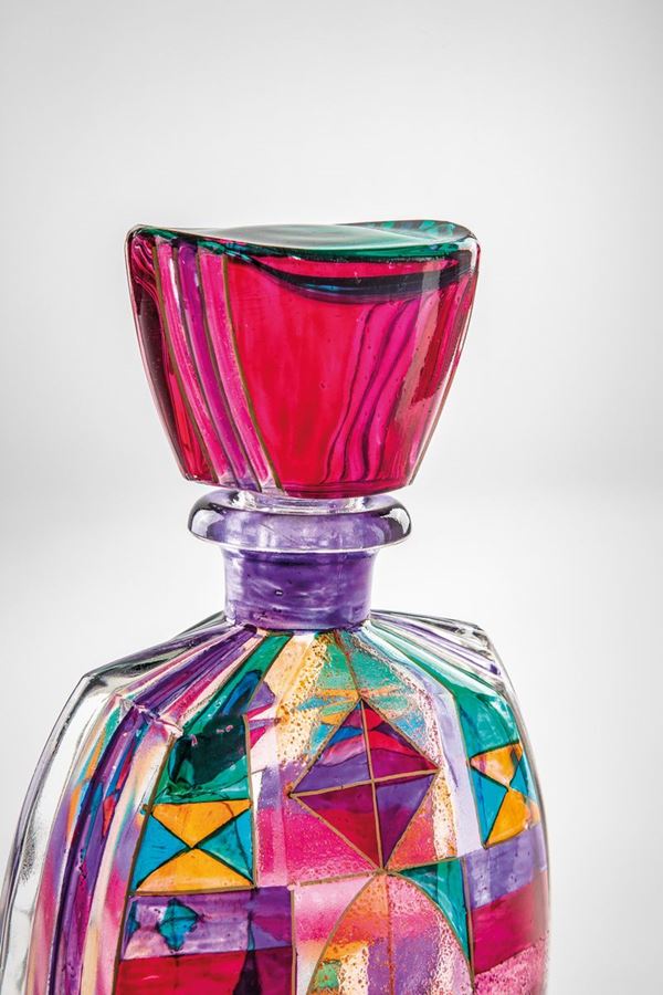 Bottiglia con tappoVetro dipinto a motivi geometrici.1940 ca.