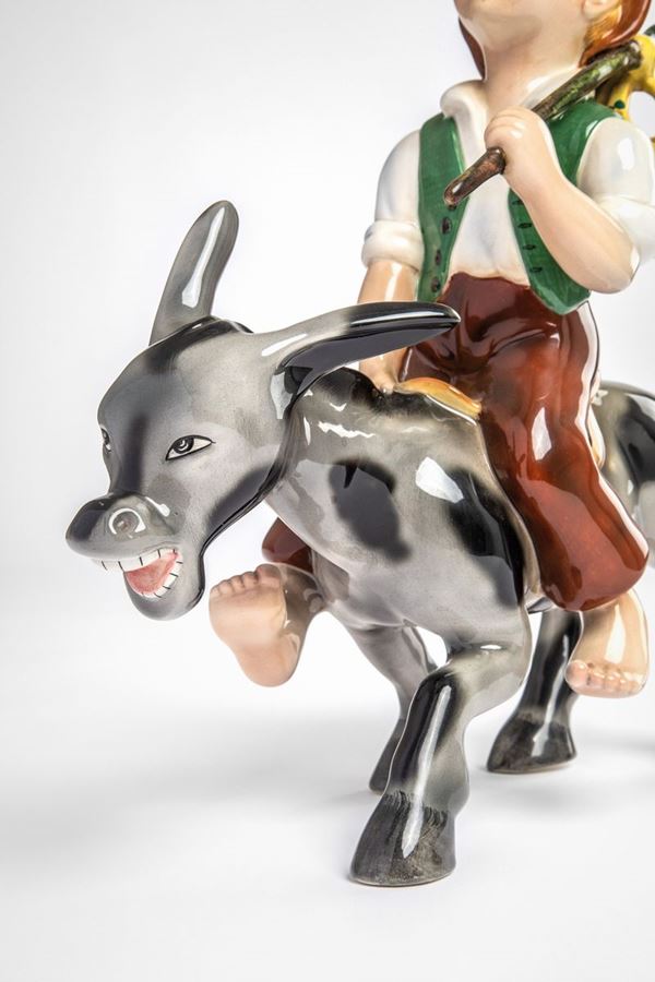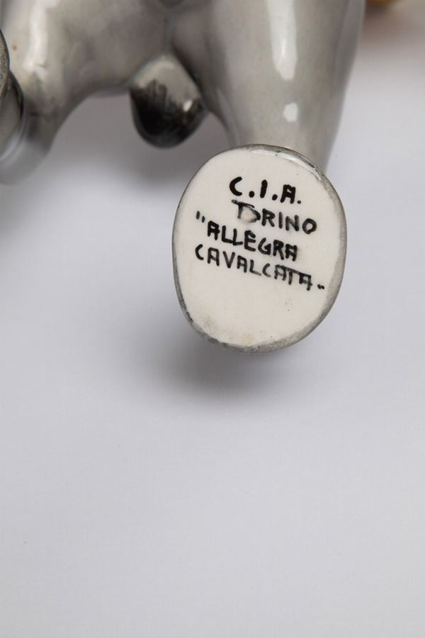 Allegra cavalcataFigura di bimbo su asinello in ceramica formata a colaggio e decorata a mano in policromia sottovernice.Prod. C.I.A. Manna, Torino 1940 ca.Marcato sotto la zampa C.I.A Torino "Allegra Cavalcata"