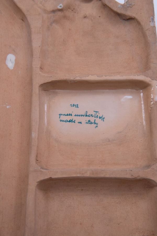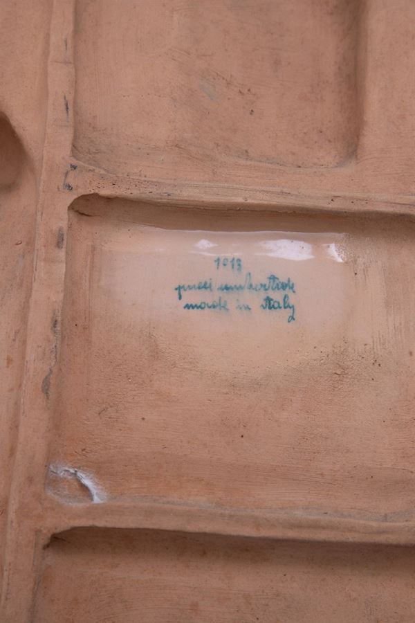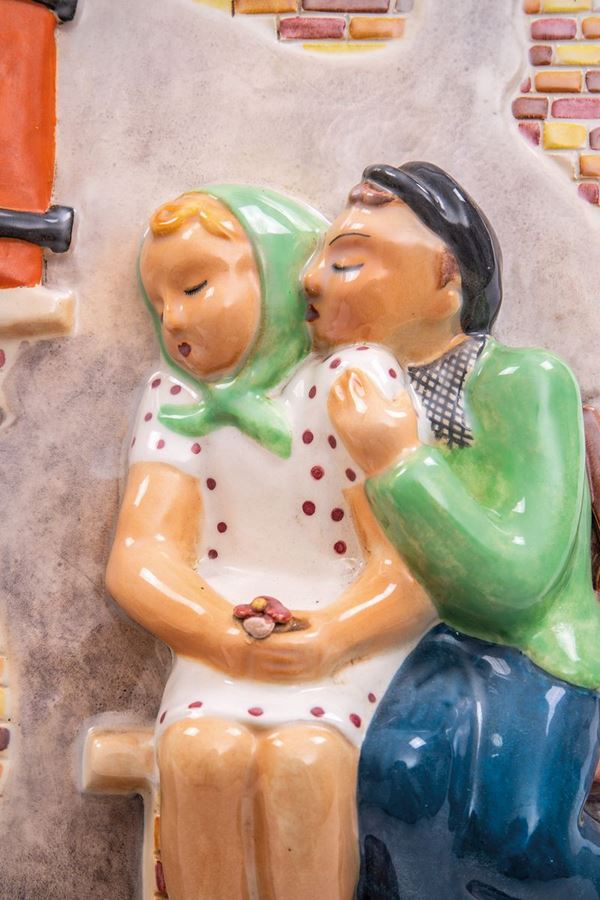 Due grandi piastre da muroTerracotta smaltata in policromia e decorata con figure in altorilievo.Prod. Pucci Umbertide, 1940 ca.Marchio manifattura e numerazione1012-1013