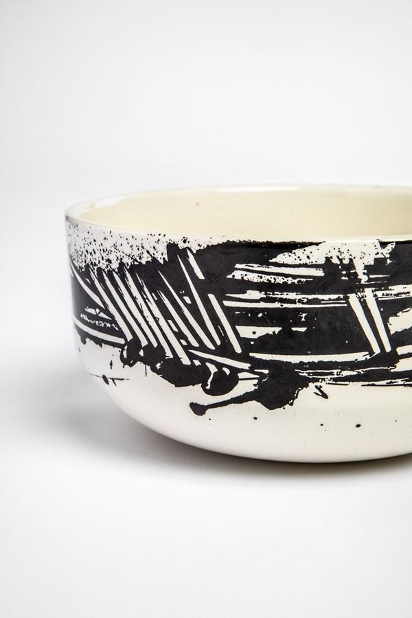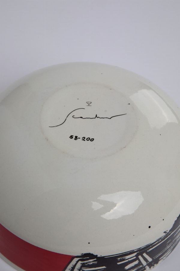 CiotolaCeramica smaltata e decorata in rosso e nero su fondo bianco.Prod. Albisola, 1970 ca.Al retro marchio manifattura, firma dell'artista e numerazione: Scanavino, 58/200
