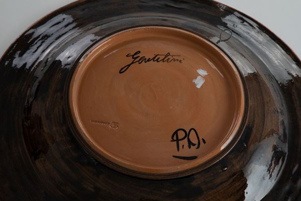 Grande piattoCeramica decorato in policromia con volto femminile.Prod. G. Rossicone, 1970 ca.Firmato al retro Gentilini P.A. e marchio impresso G. Rossicone.