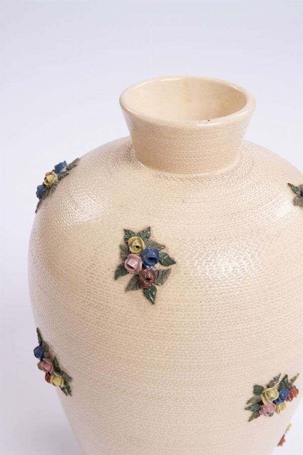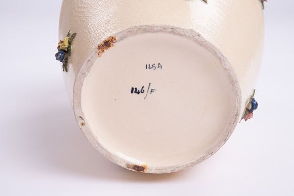 VasoCeramica con superficie decorata da applicazione di fiori policromi.Prod. ILSA, 1950 ca.Marcato sotto la base Ilsa 146/f.