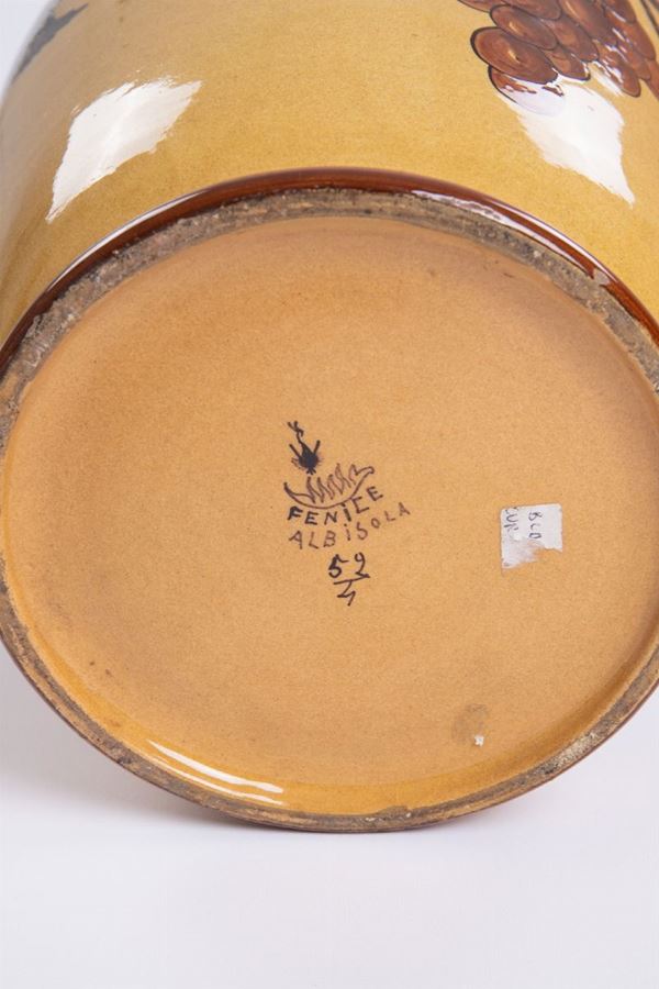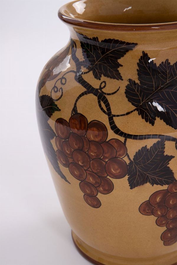 VasoTerracotta invetriata decorata con tralci di vite e grappoli d’uva.Prod. Fenice Albisola, 1940 ca.Marcato sotto la base Fenice Albisola 52/4.