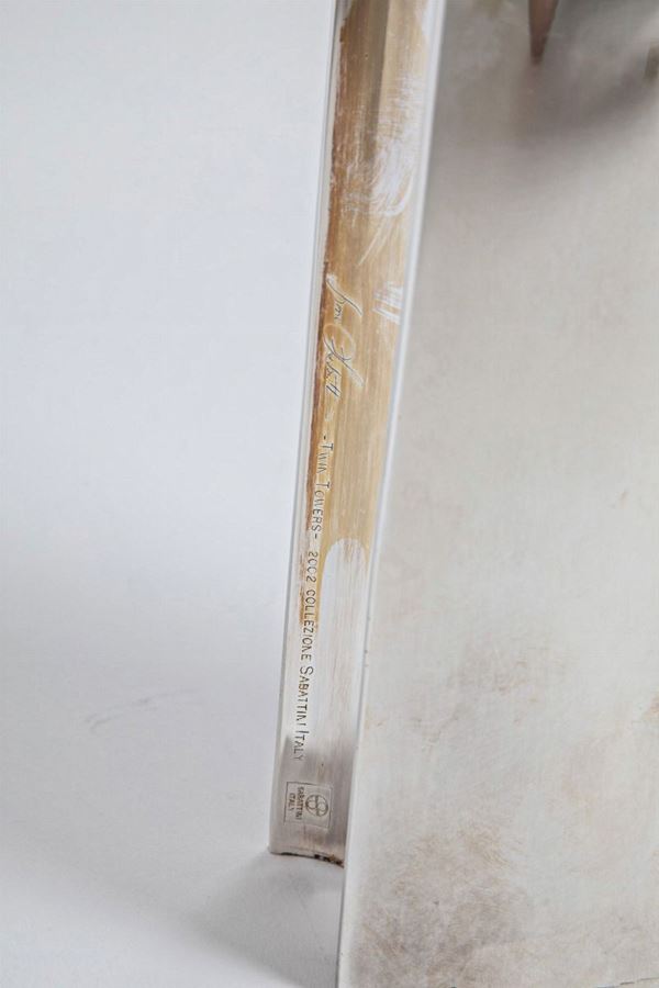 Vaso Twin TowersMetallo argentato.Prod. Sabattini, 2002Firma incisa dell'artista Twin Towers - 2002 - Collezione Sabattini Italy e marchio inciso.