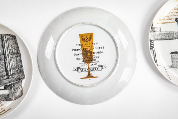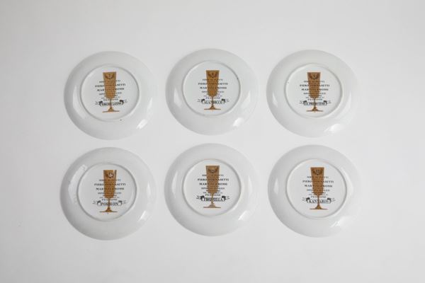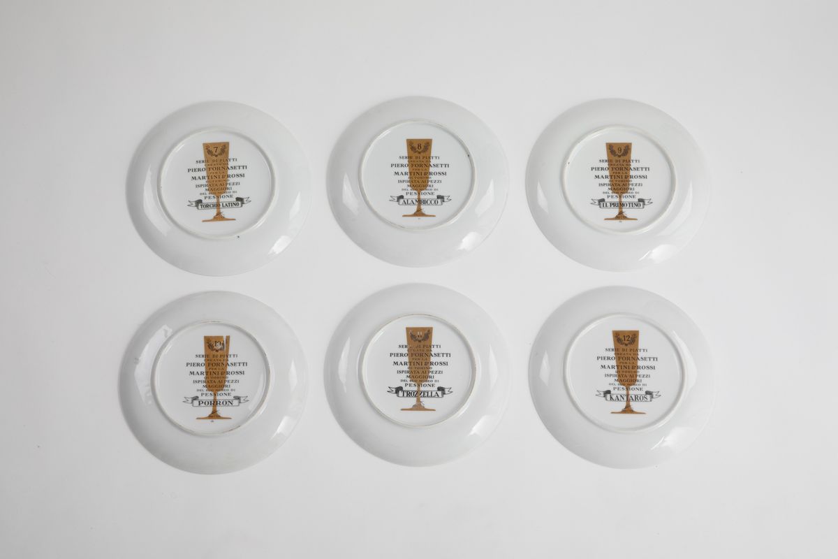 Dodici piatti serie Martini & RossiPorcellana bianca con decoro serigrafato.Prod. Fornasetti, 1950 ca.Marchio Fornasetti Milano serie per la Martini & Rossi