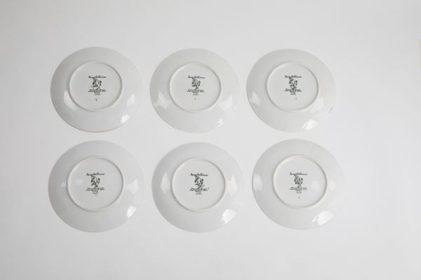 Porcellana bianca con decoro serigrafato e bordo in oro.