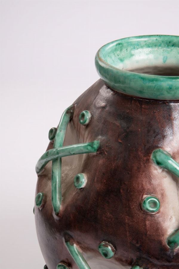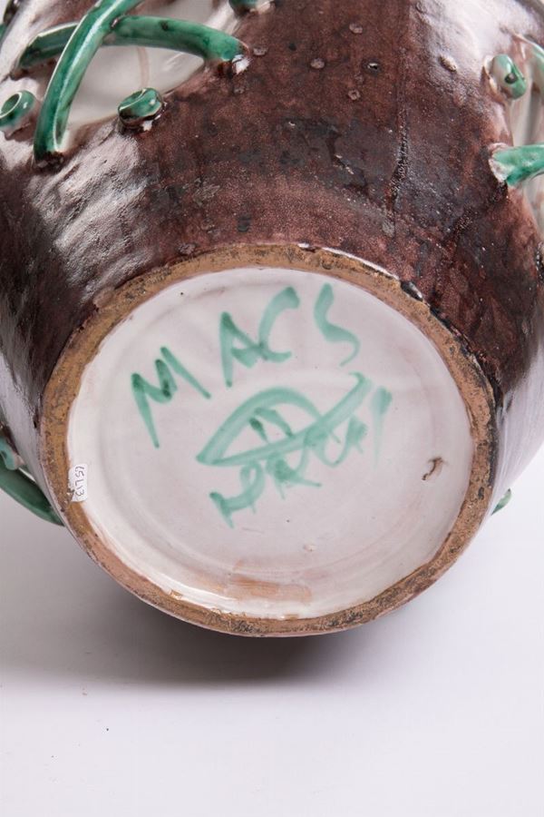 Grande vasoTerracotta maiolicata e smaltata di colore bruno con applicazioni a rilievo in verde.Prod. I.C.S. (Industria Ceramica Salernitana), Vietri 1920 ca.Firmato sotto la base MACS con simbolo grafico.