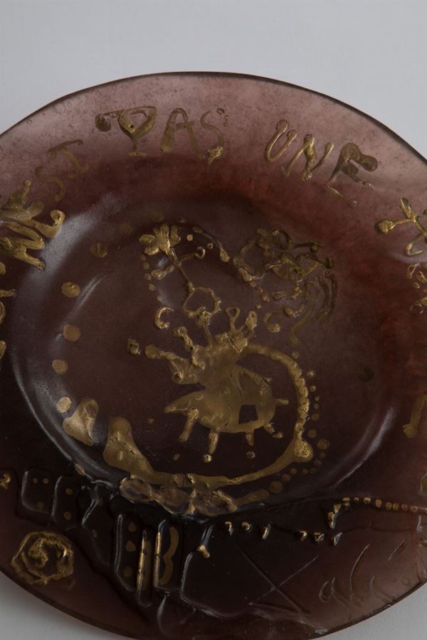 Ceci n’est pas une assiettePiatto in pasta di vetro bordeaux con decori in oro.Prod. Daum, 1970 ca.Al retro firma dell'artista e numerazione 803/2000