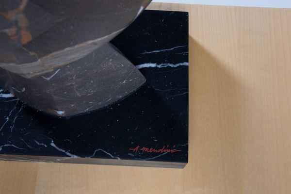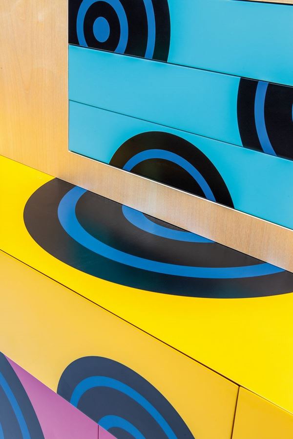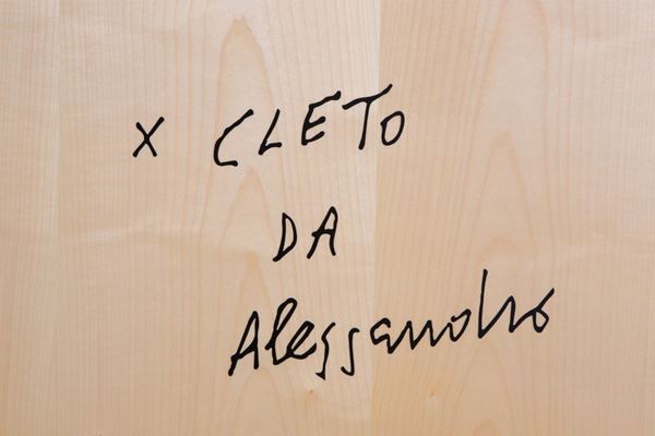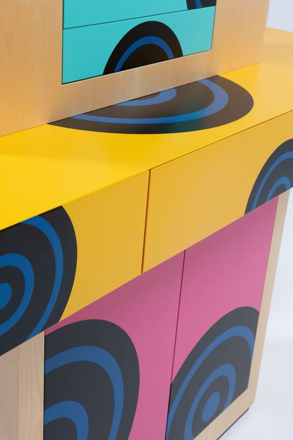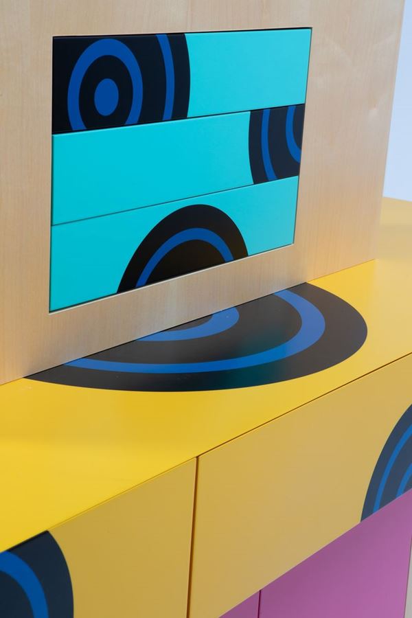 Mobilino, mobile credenzaLegno di acero naturale, legno laccato, marmo Caravaggio.Edizione Cleto Munari, 2019Edizione limitata 3 opere + 3 p.a.Firmato A. Mendini sulla base in marmo.Al retro dedica del designer X Cleto da Alessandro.