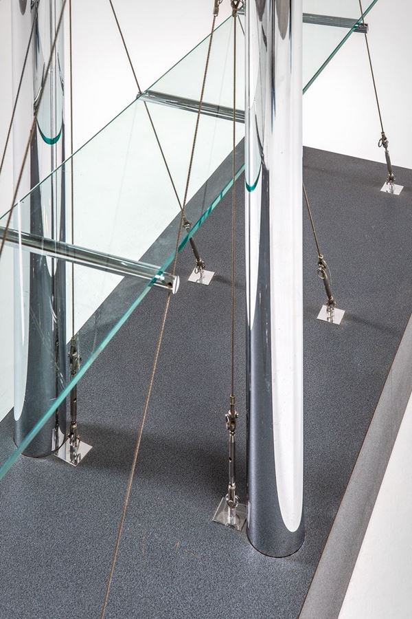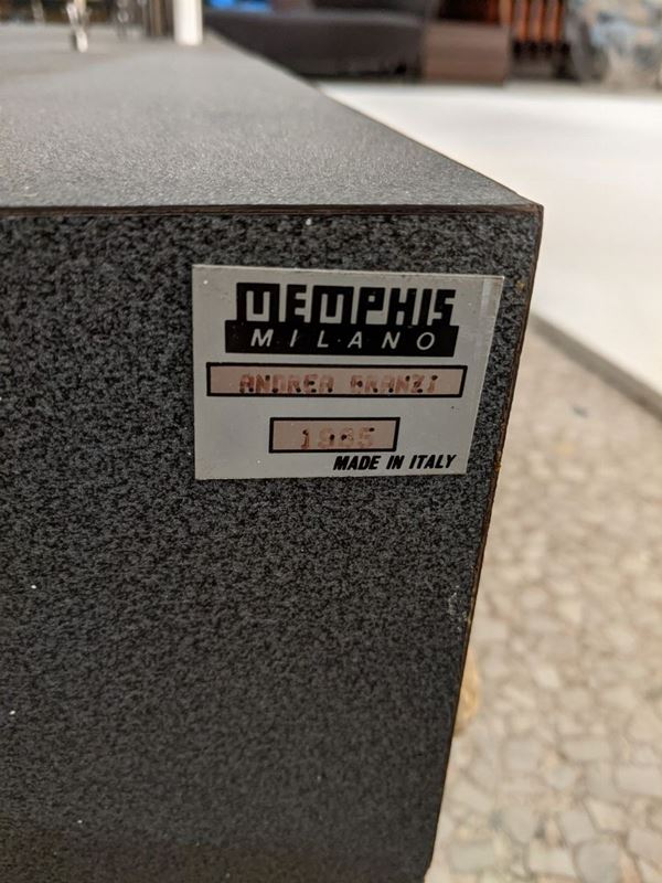 Libreria mod. MagnoliaMetallo, laminato plastico, cristallo molato, plastica.Prod. Memphis, 1985
