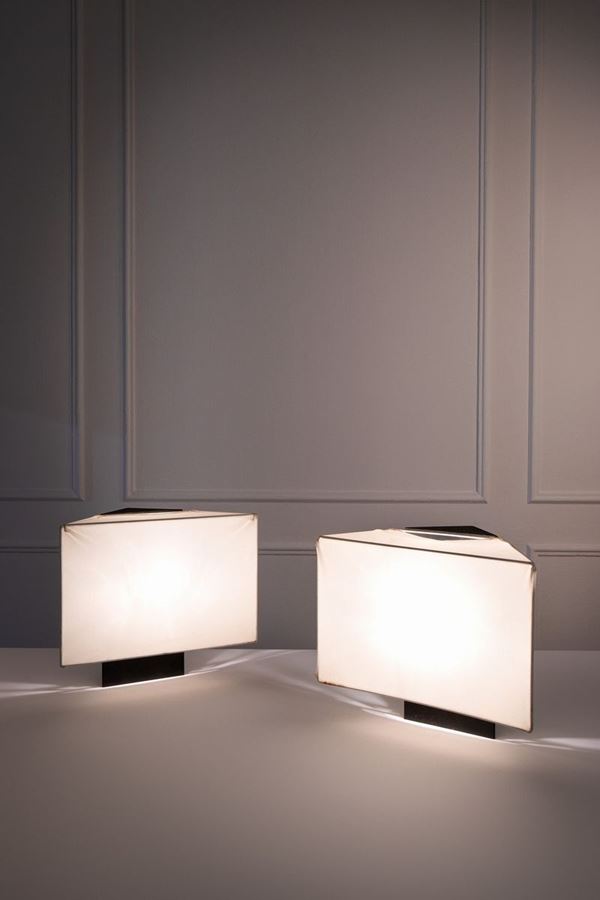 Due lampade da tavolo mod. AccademiaMetallo smaltato, tessuto.Prod. Artemide, 1978 ca.